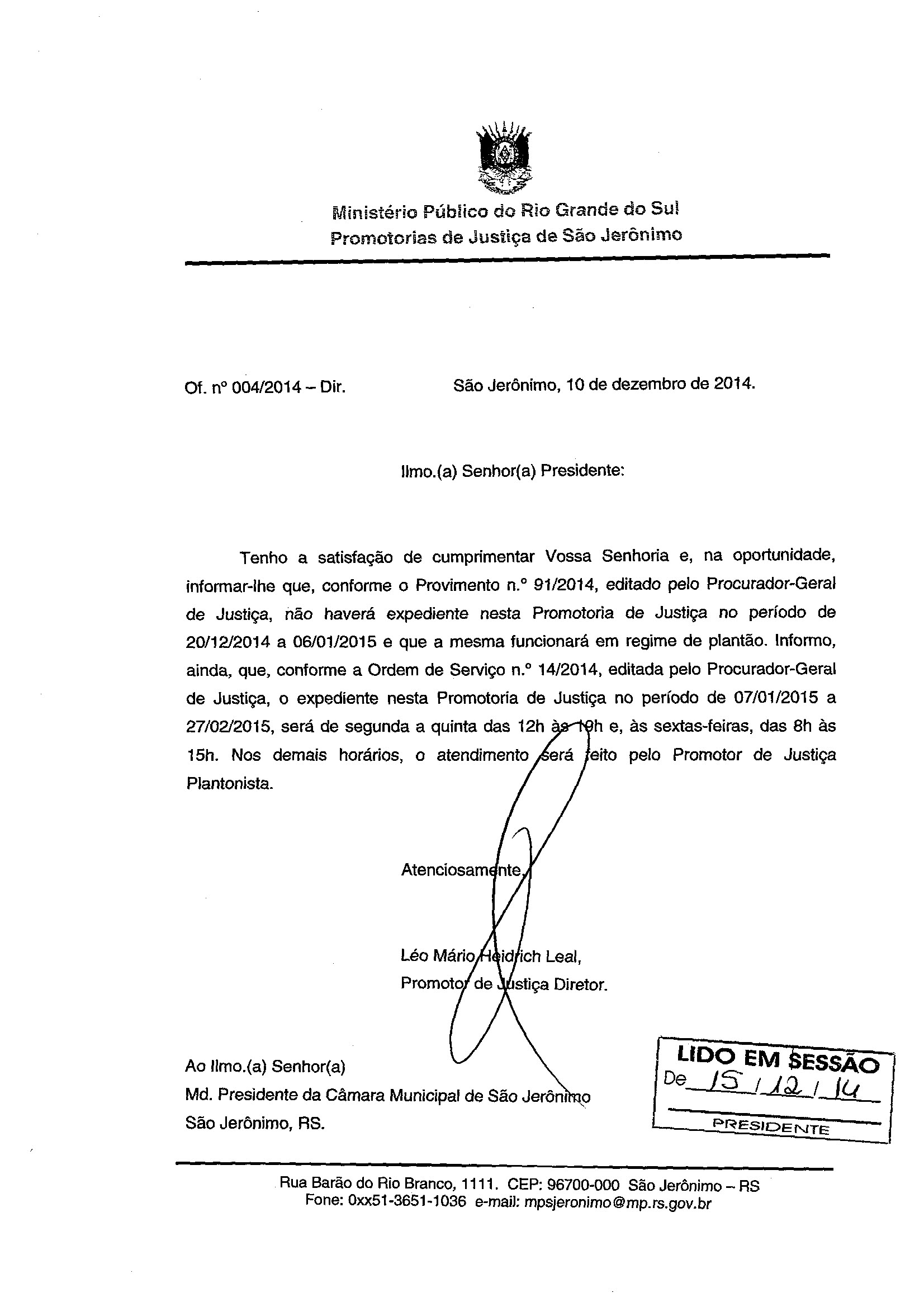Ementa: OF. Nº 004/2014 - DIR - MINISTÉRIO PÚBLICO DO RIO GRANDE DO SUL (PROMOTORIA DE JUSTIÇA DE SÃO JERÔNIMO).
